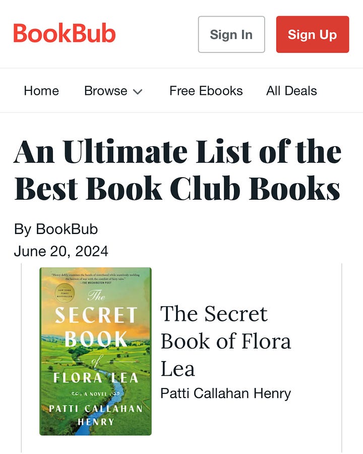 I was thrilled to see The Secret Book of Flora Lea included on BookBub’s “Ultimate List of the Best Book Club Books.” I’m in incredible company! View the full list HERE.